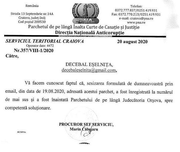 Pe 19 August procurorii DNA Craiova doar citesc articolul publicat in 18 August  de Agentia Cazanelor Dunarii – DECEBAL ESELNITA , cu titlul “Marius VASCA – candidatul PSD la functia de Primar in Eselnita, suspect de capusarea banilor comunei prin intermediul unei firme paravan ! “, iar pe 20 August, in mai putin de 24 de ore, Procurorii DNA Craiova inregistreaza in sistem sesizarea din mass-media si o inainteaza spre competenta solutionare catre Parchetul de pe langa Judecatoria Orsova. Zarurile din prima mana au fost aruncate, mai scapa cine poate si intra la joc cu zarurile din mana a doua si a treia !
