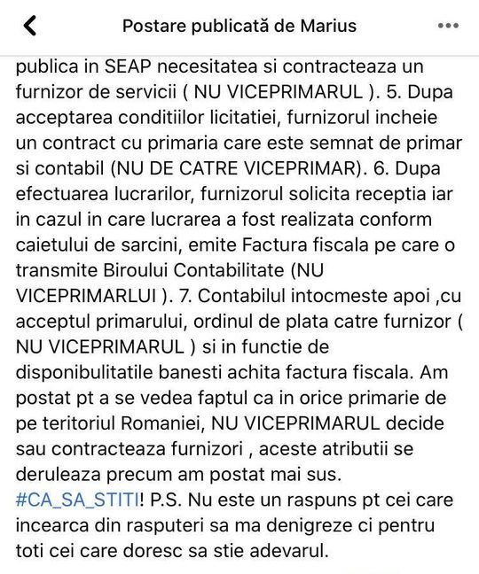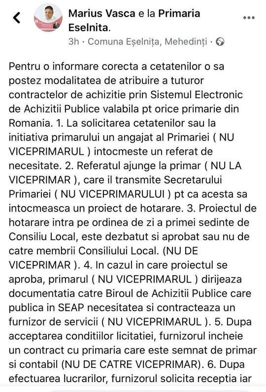 Intre timp, sa vezi miracol , s-a dezlegat limba viceprimarului si a inceput sa vorbeasca ! Domnul Viceprimar PSD Marius VASCA a decis sa dea public un raspuns si vedem ca domnia sa ne spune ca singurul responsabil de absolut tot ce s-a facut, decis si realizat este doar Domnul Primar PSD din Eselnita !